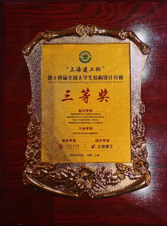 2021年10月12日-17日,第十四届全国大学生结构设计竞赛在上海交通大学闵行校区霍英东体育中心顺利举办。我院土木学子经过五天四夜的激烈角逐在首次参加国赛的情况下实现历史的突破,荣获三等奖,为学校争得荣誉。