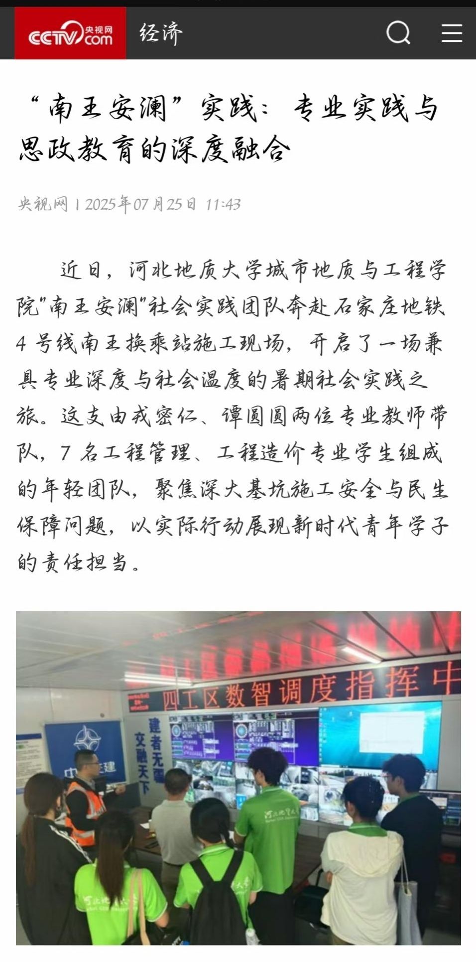 近日,河北地质大学城市地质与工程学院“南王安澜”实践团队在戎密仁、谭园园两位指导老师的带领下,深入石家庄地铁四号线南王换乘站建设一线,开展“深大基坑施工安全评估与民生保障”主题实践活动,获得了央视网、河北新闻网、环球网等主流媒体的广泛报道。