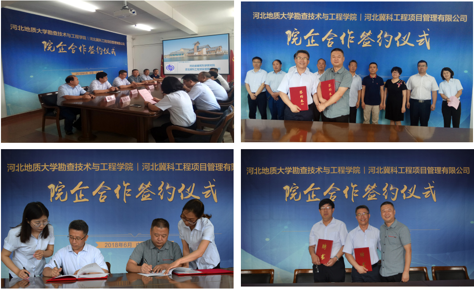 2018年6月13日,勘查技术与工程学院与河北冀科工程项目管理有限公司在河北省科学建筑研究院三楼会议室举行了院企合作签约仪式。我院院长硕良勋,副院长宋雪琳,实验中心主任李治广,教研室副主任谌会芹和相关教师解咏平及河北冀科工程项目管理有限公司总经理郭建明,副总经理宋俊岭、谷耀杰、侯克芳和各部门经理出席了签约仪式。