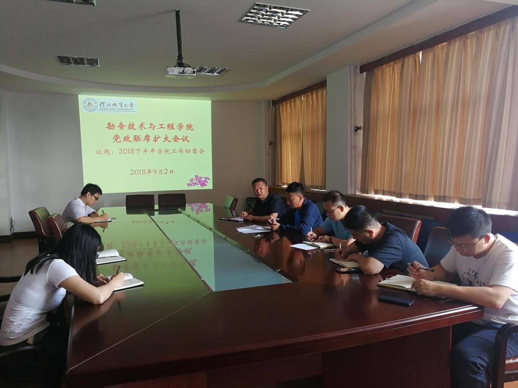 9月2日下午,勘查技术与工程学院召开党政联席扩大会议,就2018年下半年的工作重心进行了协商和部署。会议由院长硕良勋主持,党总支书记黄万顺、教学副院长宋雪琳、科研副院长袁颖、工会主席王东东、办公室主任白志贤及学院秘书张江伟、陈雪、王世文参加了会议。