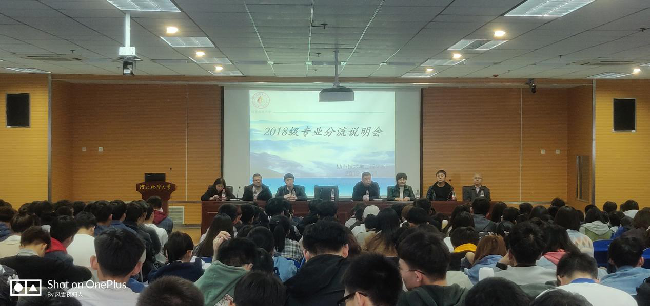 根据学校专业分流相关规定,为进一步做好2018级专业分流工作,勘查技术与工程学院领导班子召开专业分流工作专题会,讨论并制定了详细的分流方案。4月1日,在北校区图书馆召开了2018级专业分流说明会,会议由2108级辅导员朱晓玲主持,院长硕良勋做了大类内专业分流的主题发言,各教研室主任随行并进行专业解读,2018级全体学生参加了大会。