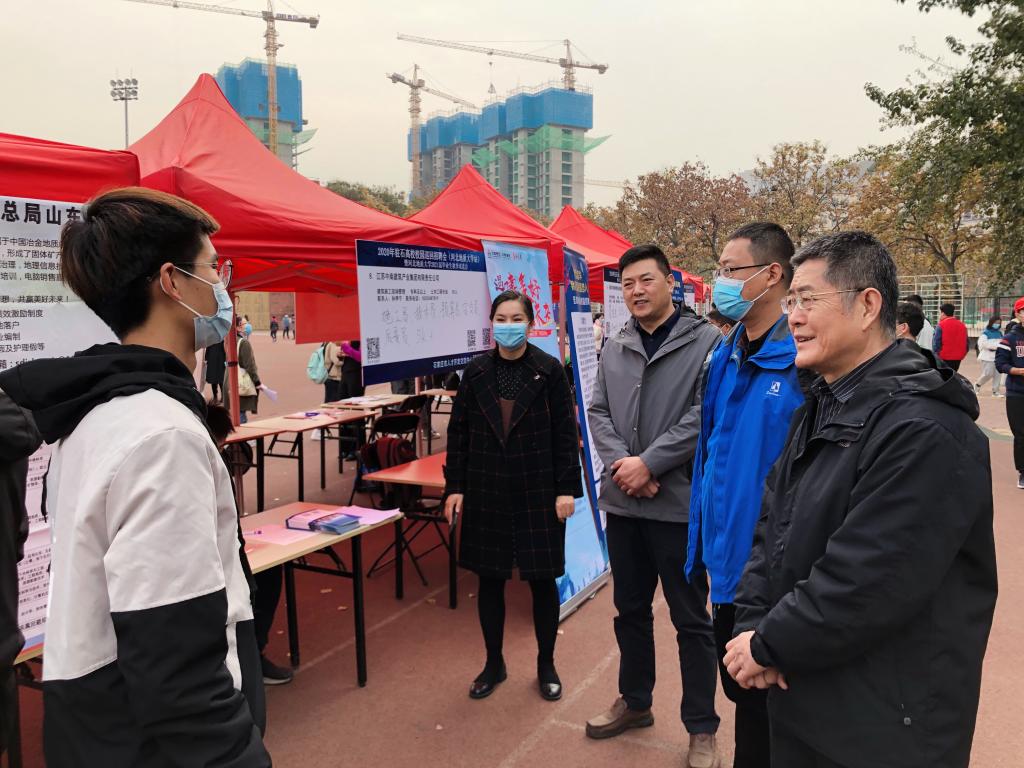 2020年11月5日上午,我校在主校区运动场举办2020年驻石高校校园巡回招聘活动暨2021届毕业生秋季双选会。学院党委书记张卫华、院长袁颖、副书记王辉、教学副院长贾磊及毕业班辅导员裴文思老师共同前往双选会现场进行调研,与用人单位、应聘者现场交流,指导学生签约。