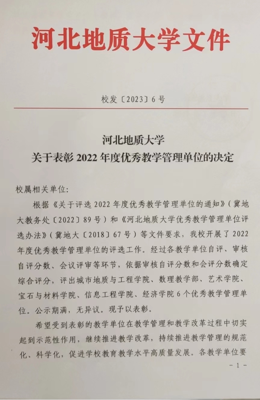 我校为表彰先进、树立典型,根据《河北地质大学优秀教学管理单位评选办法》(冀地大〔2018〕67号),经学校研究,在全校范围内评选2022年度优秀教学管理单位,最终包括我院在内的6个教学单位受到表彰,并荣获“2022年度优秀教学管理单位”称号。