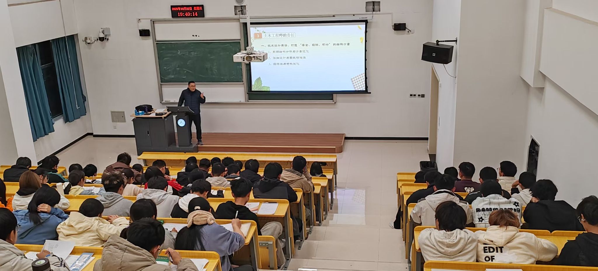 2025年10月22日,河北地质大学城市地质与工程学院土木工程系特邀企业导师、河北拓朴建筑设计有限公司结构院院长吴翼亮正高级工程师,以“土木工程师的责任” 为题为土木工程专业开展了新生导论课。土木工程专业大一新生到场聆听,在理论讲解与行业实践的碰撞中,开启了对专业领域的探索之旅。