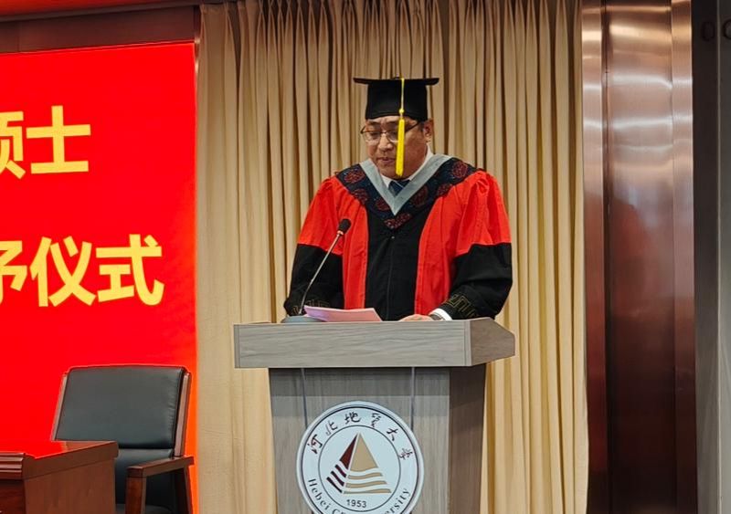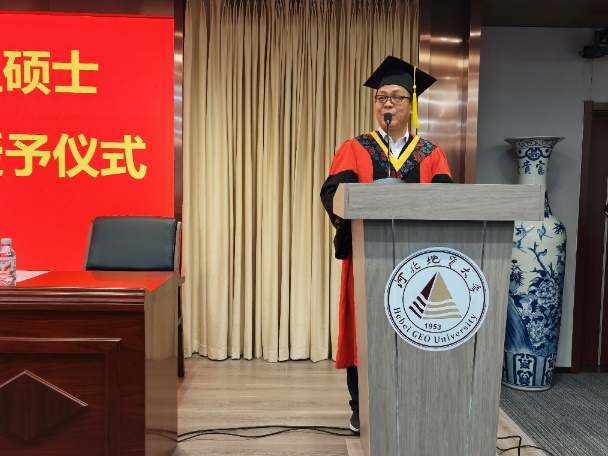 最后,研究生院院长曹南斌教授宣读河北地质大学关于授予樊红杰等同学工程管理硕士学位的决定。校党委副书记都沁军教授等领导为2026届毕业生拨穗正冠、颁发证书,并合影留念。