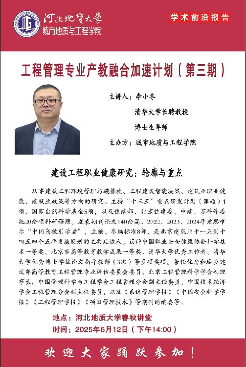2025年6月12日下午14:00,河北地质大学城市地质与工程学院在春秋讲堂开展工程管理专业产教融合加速计划(第三期)学术前沿报告。本次报告由清华大学长聘教授、博士生导师李小冬主讲,聚焦“建设工程职业健康研究:轮廓与重点”主题。