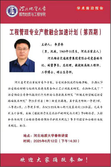 2025年6月12日下午14:30,河北地质大学城市地质与工程学院于春秋讲堂开展工程管理专业产教融合加速计划(第四期)学术前沿报告。本次报告特邀河北雄安交通投资集团有限公司党委副书记、副董事长、总经理,教授级高级工程师、工学博士、硕士生导师李彦伟主讲。