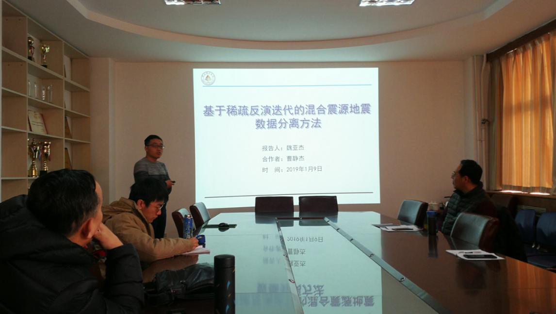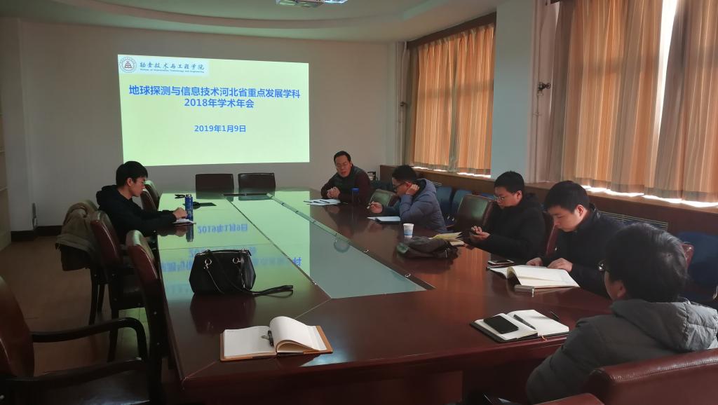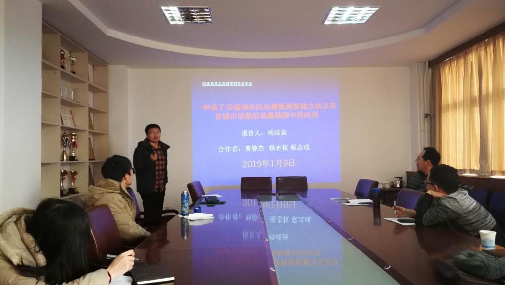 2019年1月9日上午,地球探测与信息技术河北省重点发展学科在主楼536会议室召开2018年学术年会,会议共收到了7位老师的投稿,内容涉及瞬变电磁测井、地震信号处理、浅层地震勘探、岩石物理学等领域。孟庆鑫老师介绍了自己最近几年的学术成果,自己对教学和科研的体会,并对未来的学术之路进行了展望;魏亚杰老师介绍了自己到校工作后和曹静杰老师合作的成果,提出了一种新的混合震源地震数据分离方法,有望在石油勘探中应用和节约地震勘探的采集成本;常江浩老师介绍了矿井全空间瞬变电磁法的响应特征和应用,让大家对瞬变电磁法在煤矿开采中的应用有了深入了解;杨歧焱老师介绍了基于压缩感知的地震数据重建技术及其在活动断层探测中的应用,该技术能够克服野外地震采集的困难,解决采集成本;殷晗钧老师介绍了含黏土砂岩的频散和衰减属性实验研究;曹静杰老师介绍了其提出的一种自动的地震数据去噪方法。