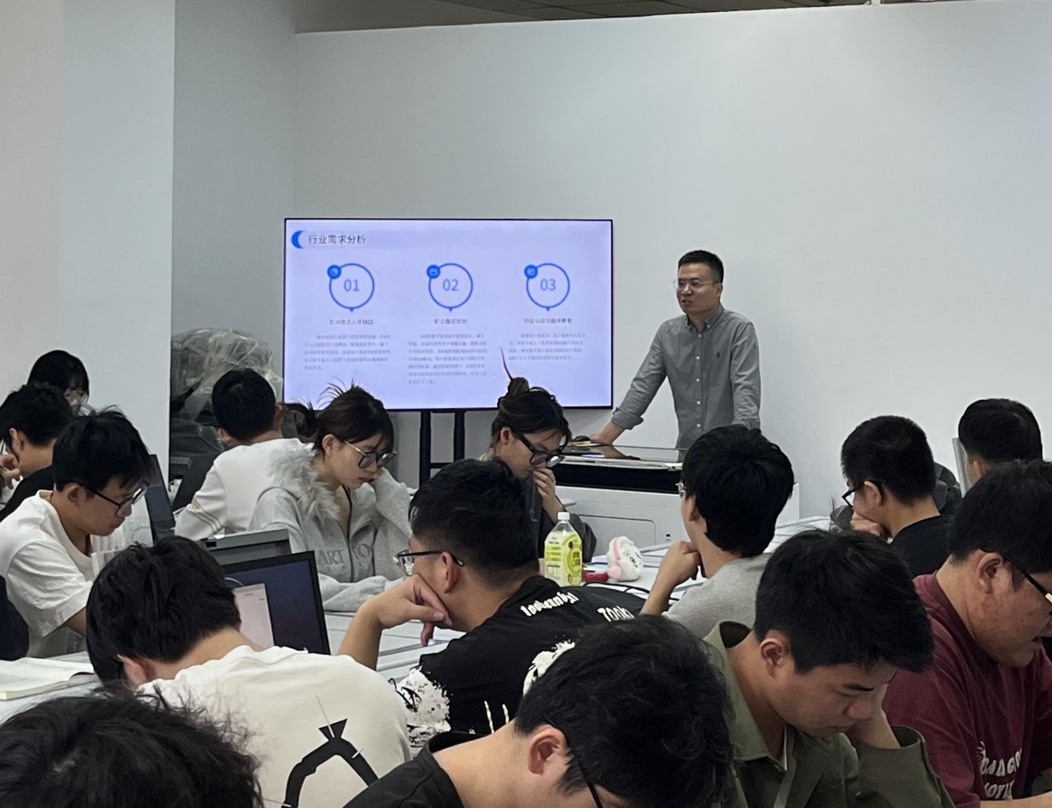 课堂上,刘总向在场各位介绍了BIM技术在工程管理中的应用。首先,他对BIM技术提出详细的定义,在此基础上指出BIM技术的五大特点以及价值体现。紧接着,他结合自己的工作经历,与大家分享了BIM技术应用的常用软件,分别从国家层面和地方省市层面介绍了BIM技术在国内的应用情况,并列举了BIM技术在工程建设项目各阶段的应用点。随后,他以大量的图片内容详细阐述了BIM技术在造价管理和工程管理中的常规应用,并以现实案例,对BIM技术在实际工程项目中的应用的予以介绍。学生对此反应较大,对BIM就业方面比较关注。