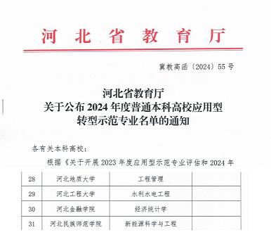近日,河北省教育厅下发了《关于开展2023年度应用型示范专业评估和2024年度应用型示范专业遴选工作的通知》,省教育厅在对上年度示范专业评估以及对新一轮示范专业遴选的基础上,重新确定了2024年度53个应用型转型示范专业(公办高校50个、民办高校3个),我院工程管理专业连续两年获批为河北省普通本科高等学校应用型转型示范专业。