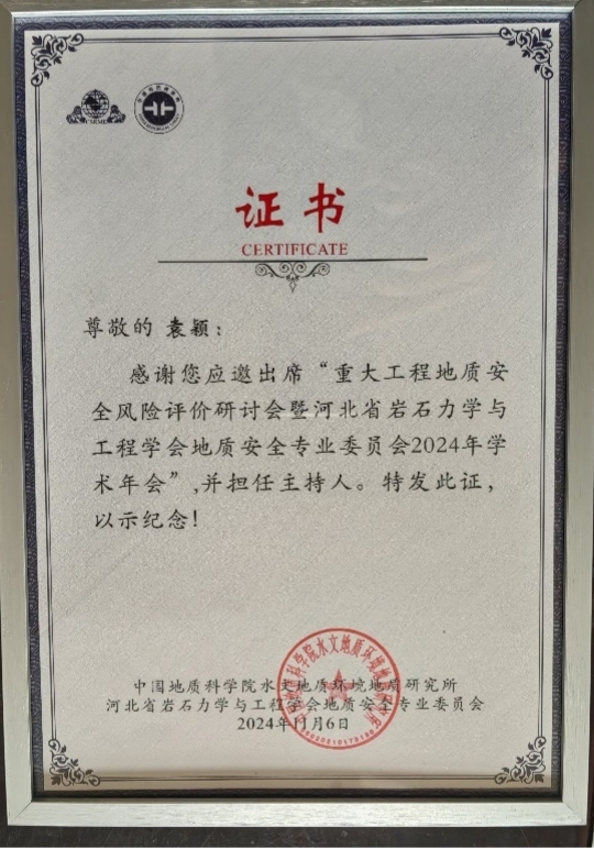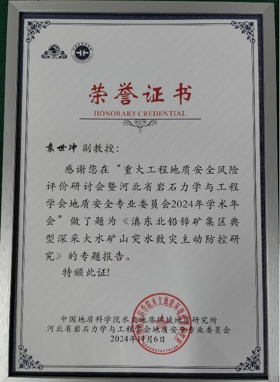 2024年11月6日,由河北省岩石力学与工程学会地质安全专业委员会发起,中国地质科学院水文地质环境地质研究所主办,河北地质大学、中国煤炭地质总局水文地质局等单位协办的“重大工程地质安全风险评价研讨会暨河北省岩石力学与工程学会地质安全专业委员会2024年学术年会”在石家庄成功举办。来自工程地质相关领域的专家学者齐聚一堂,分享最新的研究成果和技术进展。我院袁颖院长、杜国梁、孙石达、袁世冲、张文松、王昕老师和地质灾害防治与地质环境保护团队的研究生参与会议。其中,袁颖院长担任了专题报告主持人,孙石达老师作了题为《新疆北部三维磁性结构及其与天然地震分布规律的关系》的报告,袁世冲老师作了题为《滇东北铅锌矿集区典型深采大水矿山突水致灾主动防控研究》的报告。本次会议的成功举办,不仅为地质安全相关领域的专家学者提供了一个高水平的学术交流平台,也为推动地质灾害防治技术的创新与实践应用奠定了坚实的基础,加强了我校与中国地质科学院水文地质环境地质研究所、中国煤炭地质总局水文地质局等相关单位的交流与合作。