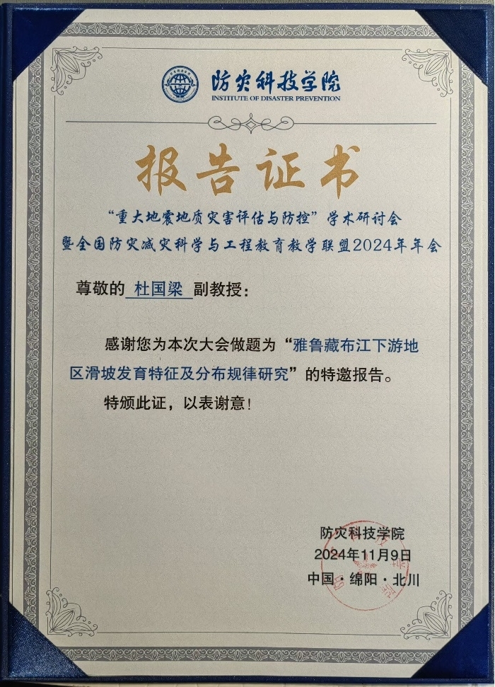 2024年11月8日,由全国防灾减灾科学与工程教育教学联盟发起,应急管理大学(筹)、地震地质灾害监测与防控科普教育(研学)基地主办,中国地震学会工程勘察专业委员、5·12汶川特大地震纪念馆、北川羌族自治县应急管理局会等单位协办的“重大地震地质灾害评估与防控学术研讨会暨全国防灾减灾科学与工程教育教学联盟2024年年会”在北川羌族自治县成功举办。来自工程地质和地质灾害防灾减灾相关领域的相关专家学者齐聚一堂,共同分享最新的研究成果和技术进展。我院杜国梁和袁世冲老师参与会议。在本次会议中,我院杜国梁老师做了题为《雅鲁藏布江下游地区滑坡发育特征及分布规律研究》的学术报告,并就防灾减灾科学与工程专业建设和人才培养方面的经验和成果与应急管理大学(筹)、南京工业大学、山东科技大学、东华理工大学等高校进行了深入交流,会后全体专家学者共同参观考察了北川老县城地震遗址。通过此次会议,进一步加强了我校与防灾减灾科学与工程教育教学联盟相关高校的交流与合作。