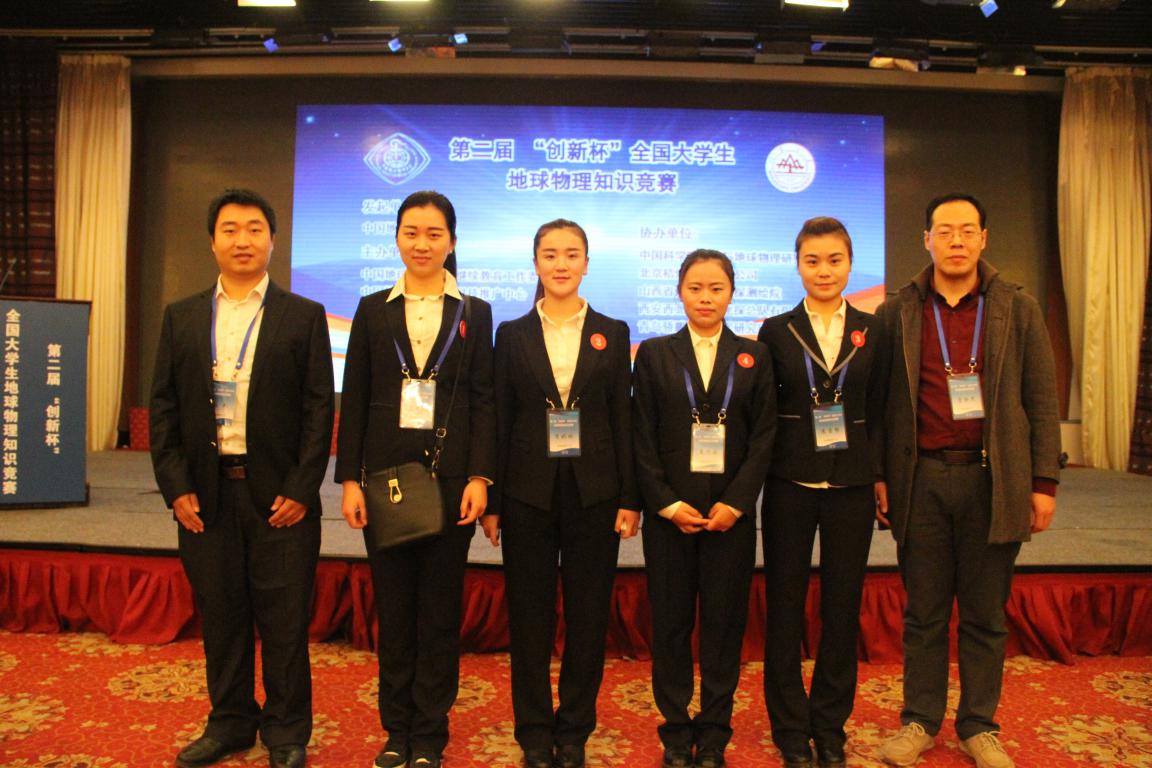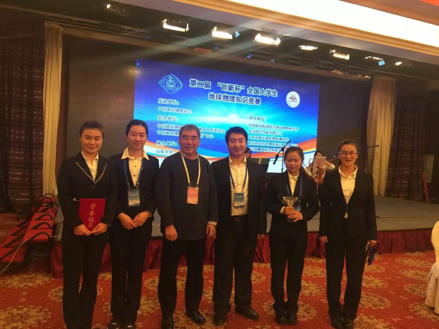 第二届“创新杯”地球物理知识竞赛于12月8日-10日在济南市山东大学举行,我校代表队由地球信息科学与技术专业大三学生吕紫艺,夏思茹,李晓婷,苏雪静四位同学组成,陈雄博士为指导老师,地球信息科学与技术教研室主任曹静杰副教授为领队,经过视频展现,现场自我展现、知识答题、专家提问等五个环节的激烈角逐后获得三等奖,一同获得三等奖的高校还有中国地质大学(武汉),长安大学,吉林大学,中南大学4所高校。本次比赛参赛队伍有14个,国内拥有地球物理类本科专业的院校基本上都参加了比赛。