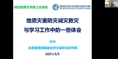2021年3月5日下午,应城市地质与工程学院邀请,由河北地质大学教育发展基金会“九鼎讲座”承办,应急管理部国家自然灾害防治研究院许冲研究员作关于“地质灾害防灾减灾救灾与学习工作中的一些体会”的学术报告,本场讲座是我校“九鼎讲座”系列讲座之一,由河北地质大学城市地质与工程学院主办,河北地质大学教育发展基金会“九鼎讲座”基金赞助。本次报告会由袁颖院长主持,活动有近230余名师生参与。