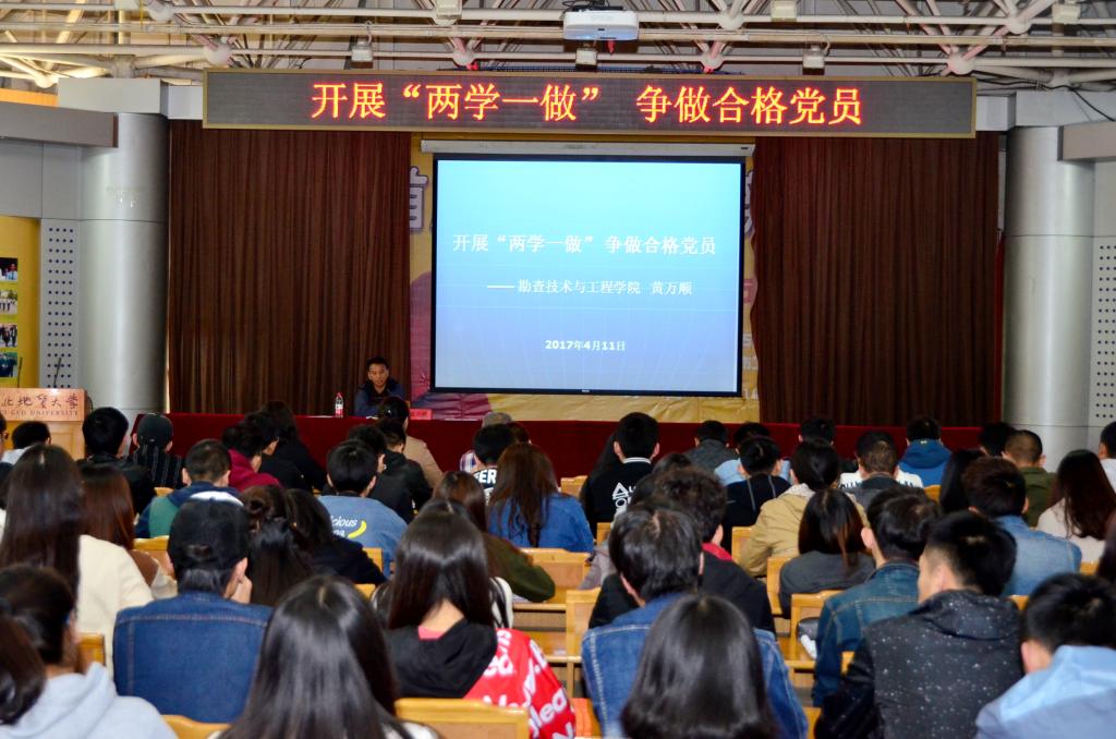 2017年4月11日,勘查技术与工程学院在我校科技报告厅组织开展“两学一做” 争做合格党员党课活动,党支部书记和支部委员、辅导员、全体学生党员、入党积极分子、班长团支部书记、以及团委学生会和科协的主要干部参加了会议。党总支书记黄万顺担任主讲。