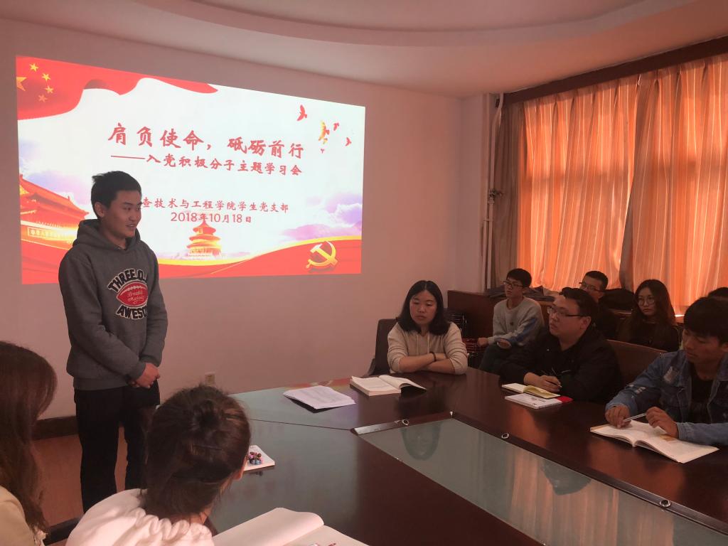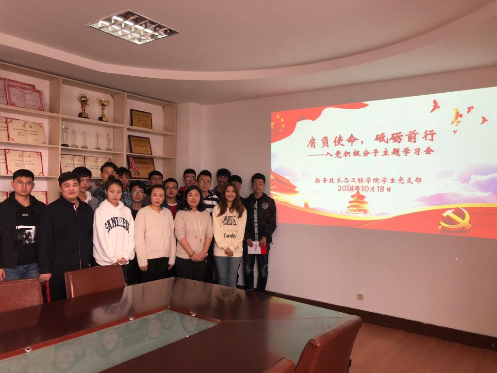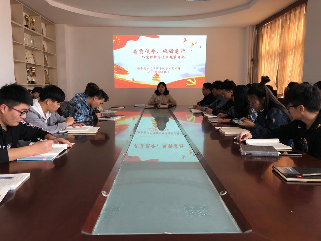2018年10月18日,勘查技术与工程学院学生党支部组织了“肩负使命,砥砺前行”入党积极分子主题学习会。学生党支部书记朱晓玲及全体学生党员和入党积极分子参加了此次会议。