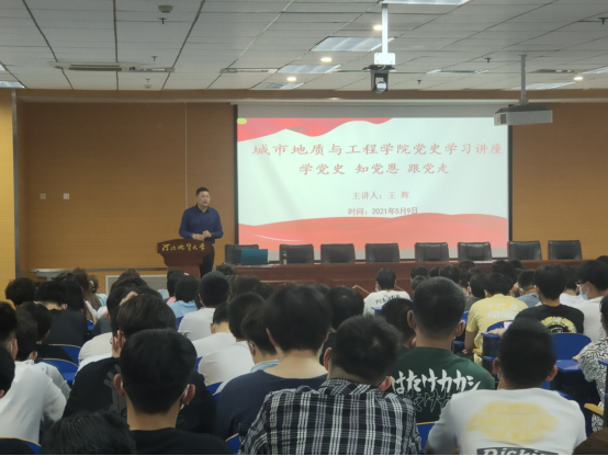 正值中国共产党百年华诞,习近平总书记提出在全党开展党史学习教育,为提高我院青年大学生知史爱党,学史明德的理想信念。按照学院党史学习教育安排,城市地质与工程学院党委副书记王辉,于2021年5月9日晚上19:00在图书馆401为北校区2020级学生作“学党史,念党恩,跟党走”党史学习教育专题讲座。