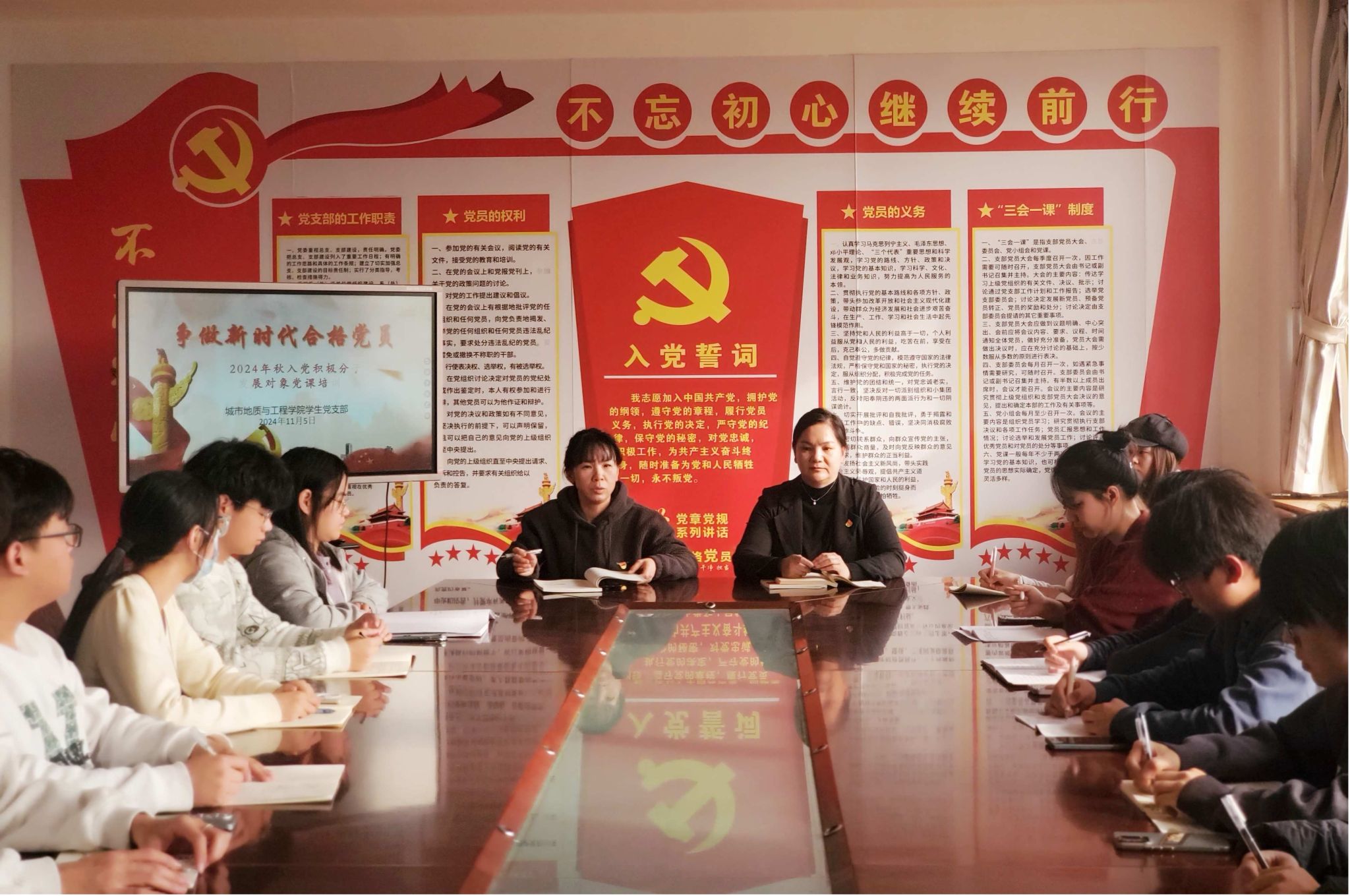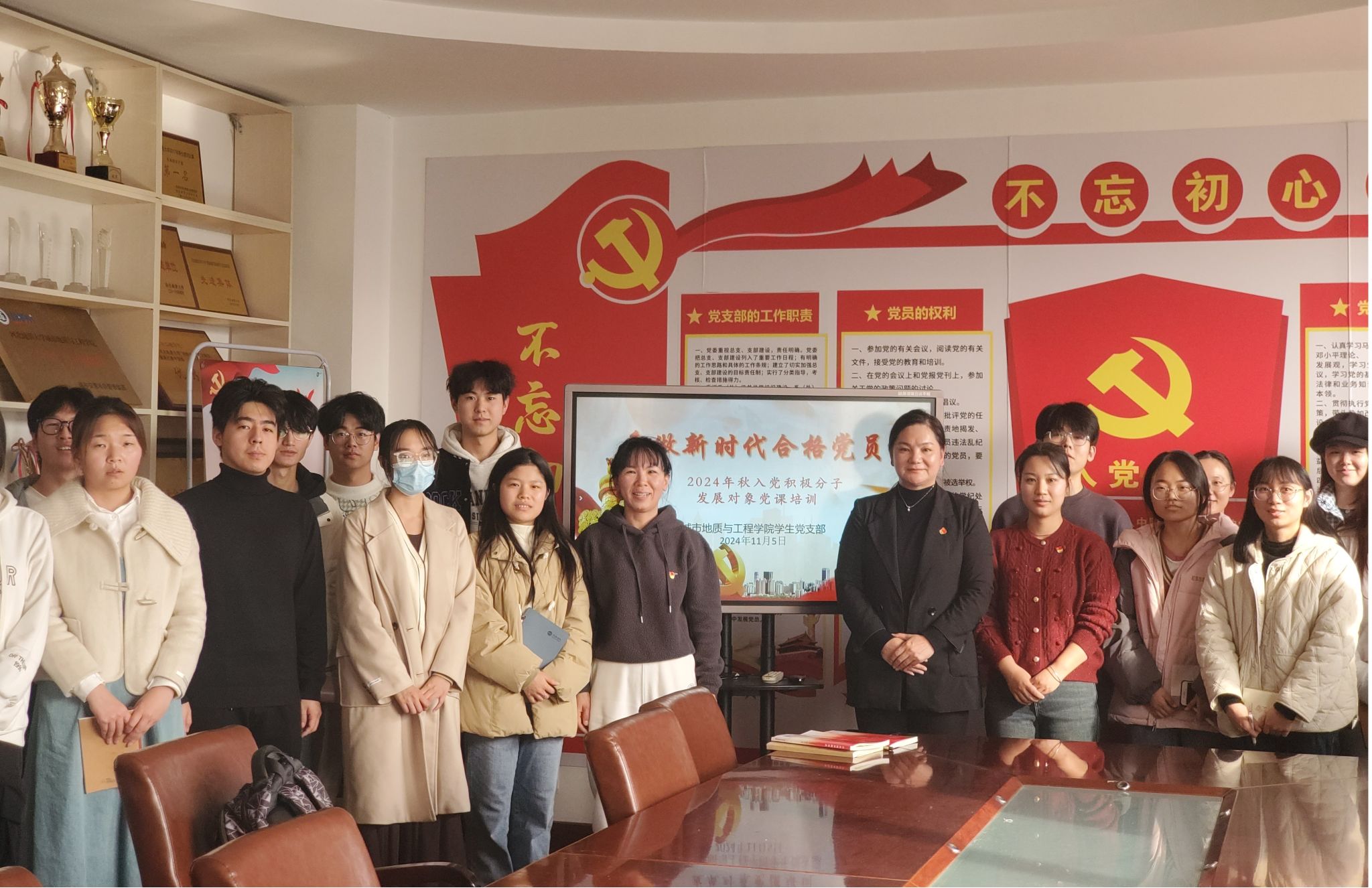 根据校党委组织部相关通知要求,结合城市地质与工程学院实际情况,学院党委精心组织安排,于11月5月—11月12日开展了2024年秋季入党积极分子、发展对象党课培训系列活动。旨在进一步加强和提升党员发展工作,提高入党积极分子和发展对象的思想政治素质,引导他们坚定理想信念,积极向党组织靠拢。