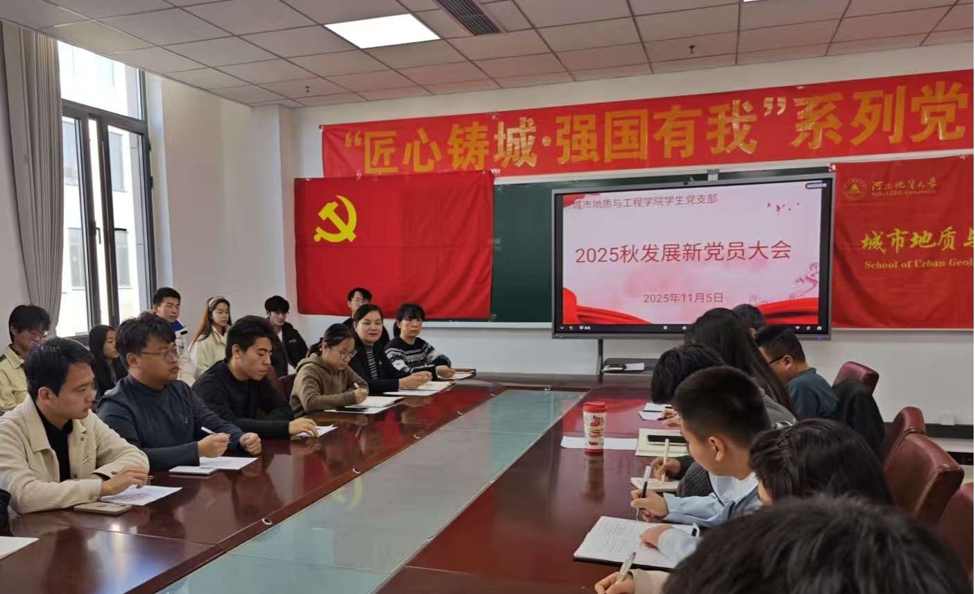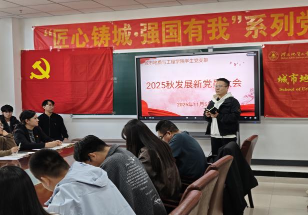 为扎实推进党员发展工作,为党组织注入新鲜地质力量,切实将“匠心铸城”党建品牌理念融入人才培养全过程,11月5日,学院学生党支部在学院会议室227召开了2025年秋季发展新党员大会。学院党委副书记李蕊、支部全体正式党员(预备党员)及发展对象参加了会议,会议由支部书记裴文思主持。