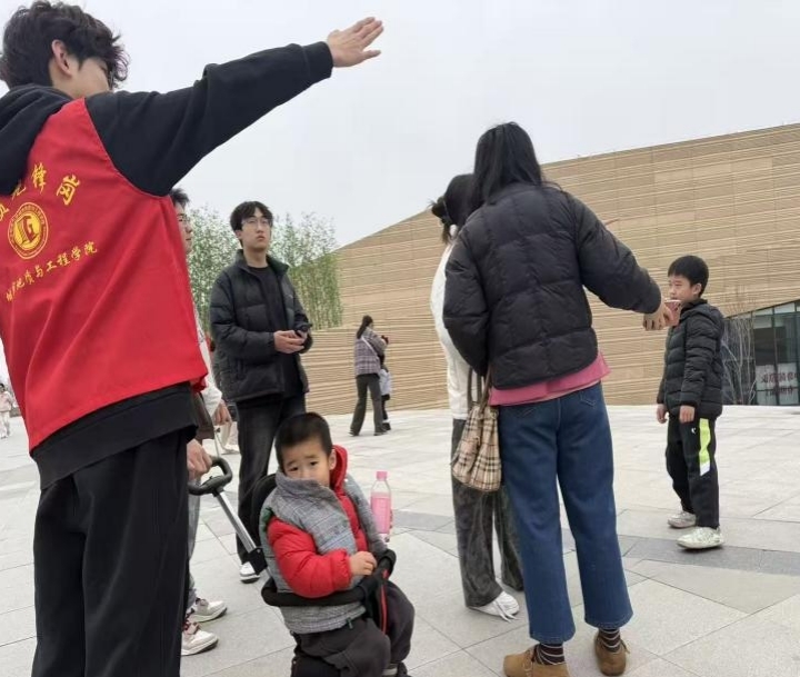 校园博物馆入口处,志愿者化身“活地图”与“服务员”:为行动不便者提供搀扶引导,为带婴家庭推行婴儿车,为游客拍摄纪念照、解答路线咨询。他们用耐心与细致化解游客难题,用微笑与帮助传递城市温度,让“奉献、友爱、互助、进步”的志愿精神在细节中闪光。