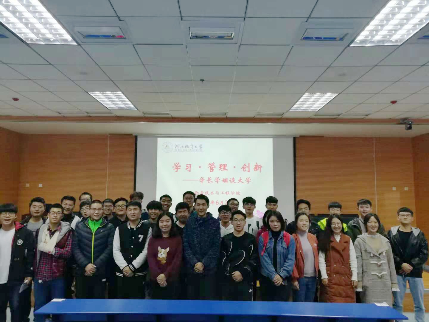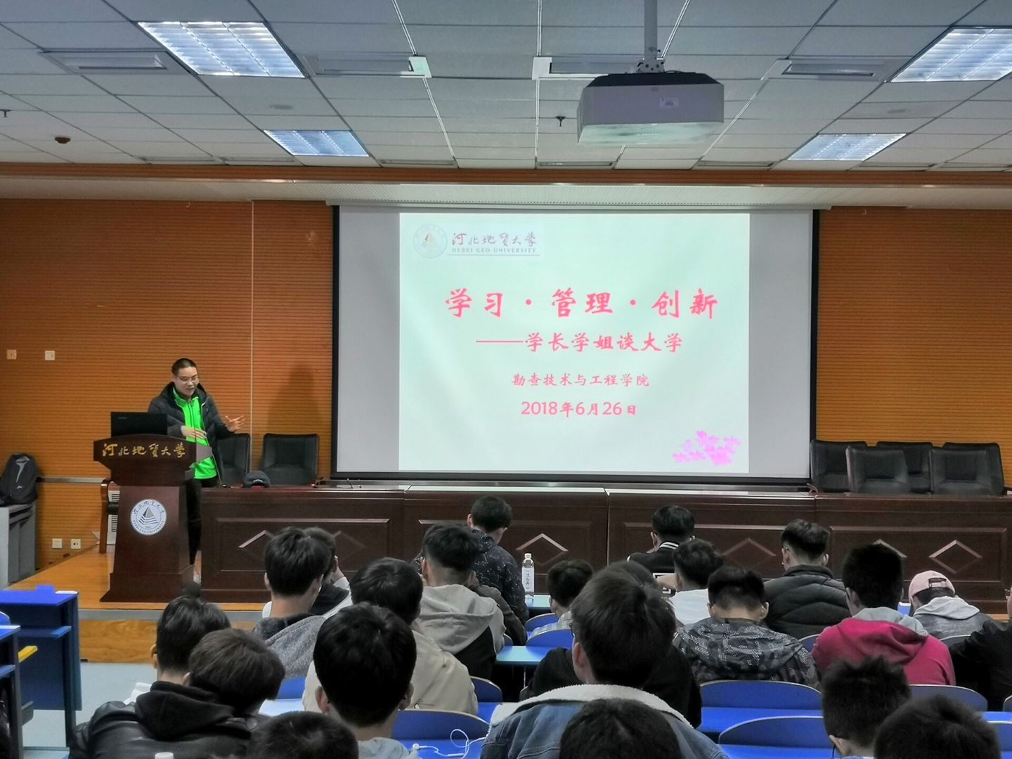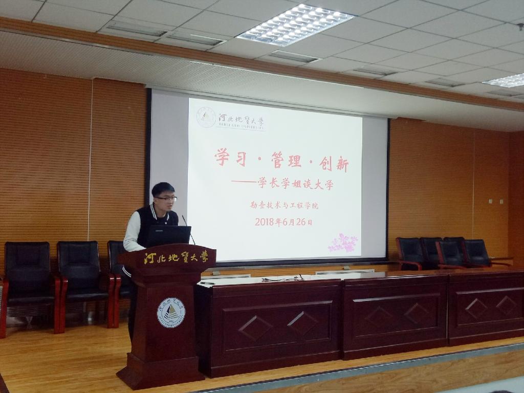 2018年11月13日中午,勘查技术与工程学院在北校区图书馆401召开“仰山慕水”新生培育计划系列活动之“朋辈引领”——《学长学姐谈大学》主题经验分享交流会。活动由团委书记、2018级辅导员朱晓玲老师主持,2015级优秀学生代表魏曙博同学、2016级优秀学生代表韩敬萱同学、任思远同学出席了本次活动,参与本次活动的还有全体大一新生。
