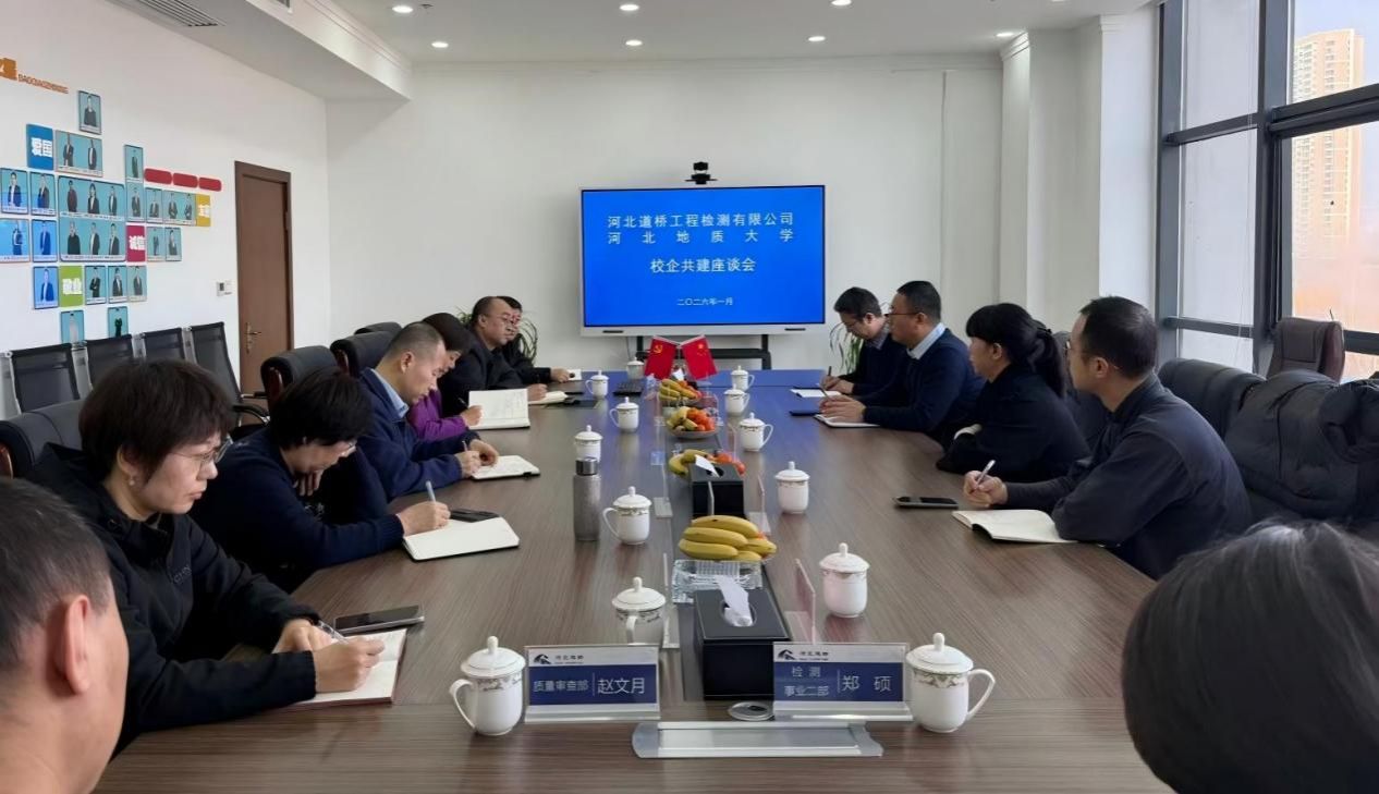 2026年1月28日上午,河北地质大学城市地质与工程学院副院长贾磊带队赴河北道桥工程检测有限公司开展交流洽谈,旨在深化校企合作、搭建产学研协同创新平台、学生实习实践基地建设。河北道桥工程检测有限公司总经理魏春辉对贾磊一行的到来表示热烈欢迎,副总经理刘峰辉主持交流会并介绍企业情况。
