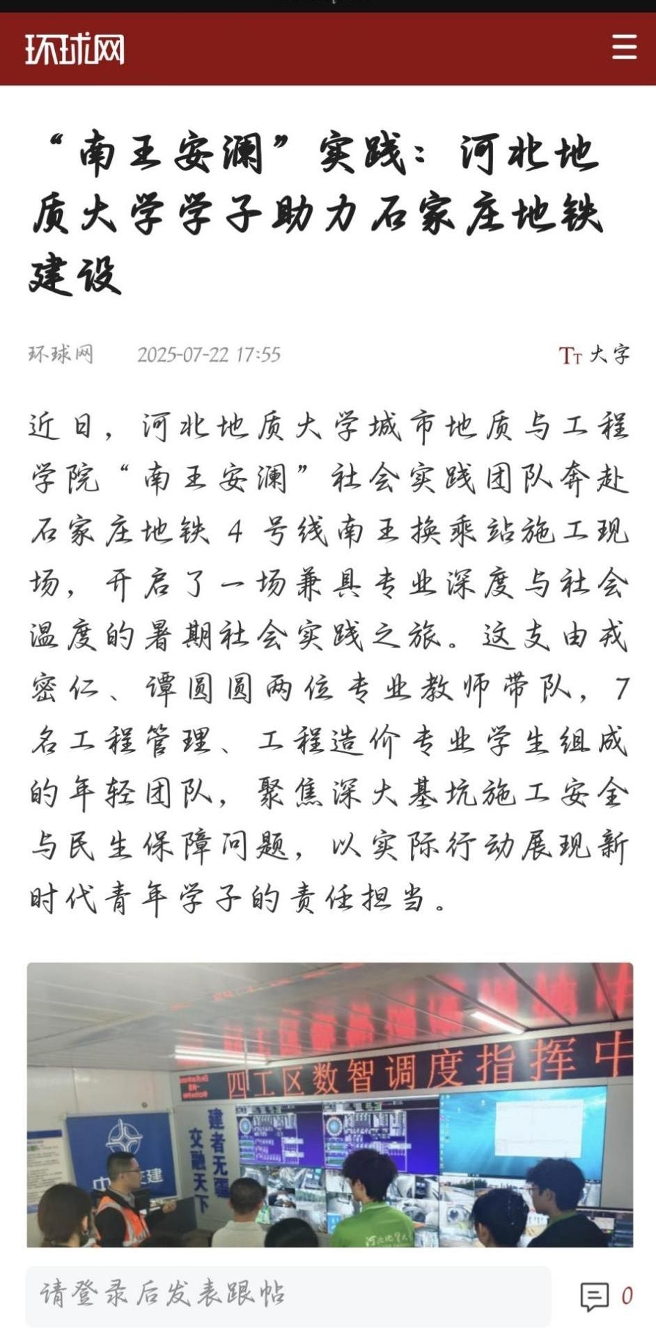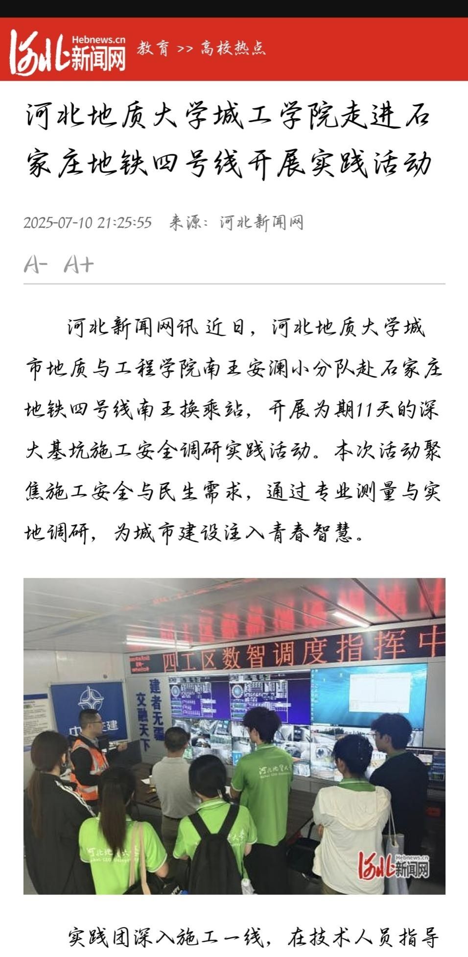 近日,河北地质大学城市地质与工程学院“南王安澜”实践团队在戎密仁、谭园园两位指导老师的带领下,深入石家庄地铁四号线南王换乘站建设一线,开展“深大基坑施工安全评估与民生保障”主题实践活动,获得了央视网、河北新闻网、环球网等主流媒体的广泛报道。